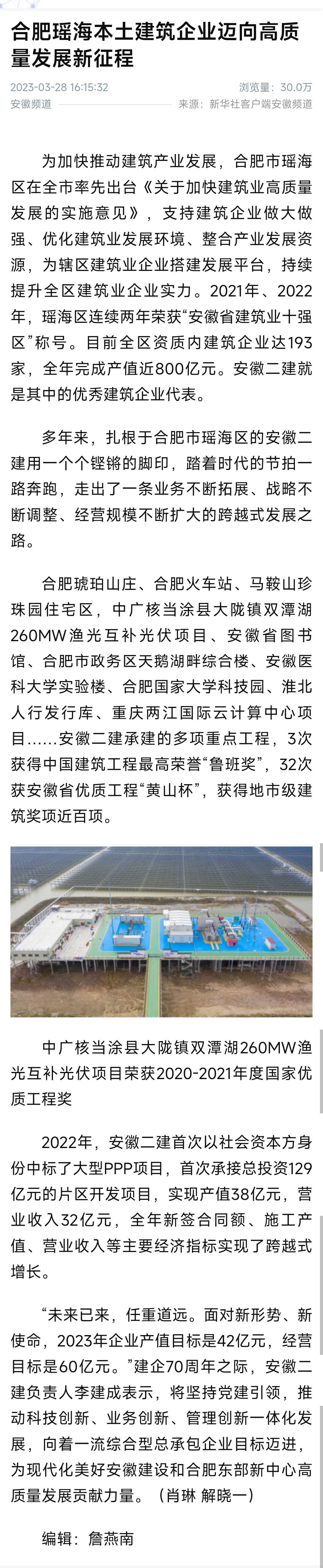時(shí)光向前,二建向上!3月28日,自人民網(wǎng)、央廣網(wǎng)、中國網(wǎng)、中國日報(bào)網(wǎng)、安徽日報(bào)客戶端等主流媒體集中報(bào)道安徽二建七十年發(fā)展成就后,公司作為合肥瑤海本土優(yōu)秀建筑企業(yè)邁向高質(zhì)量發(fā)展新征程,首次刊登在新華社客戶端安徽頻道,一經(jīng)報(bào)道瀏覽量達(dá)30萬次。