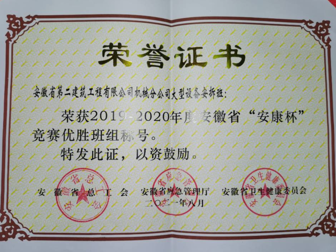 2019-2020年“安康杯”優(yōu)勝競(jìng)賽班組--安徽二建機(jī)械分公司安拆班
