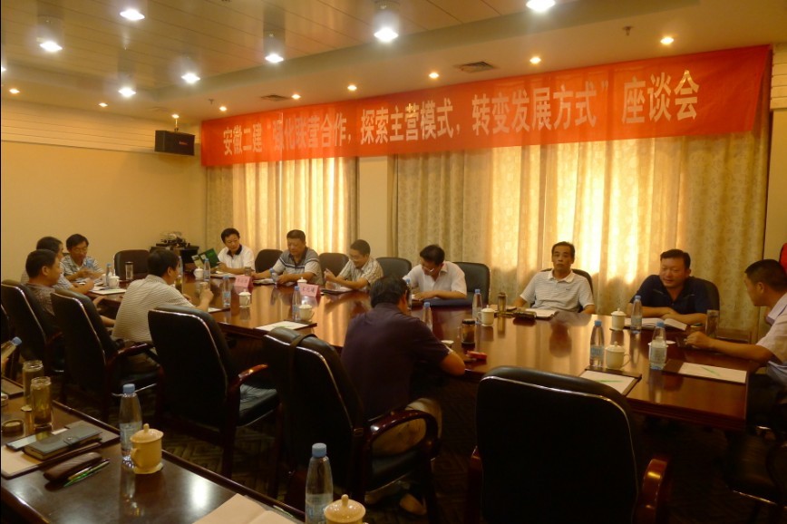 8月25日,安徽二建公司就“如何強(qiáng)化聯(lián)營(yíng)合作管理,探索主營(yíng)業(yè)務(wù)發(fā)展模式,轉(zhuǎn)變發(fā)展方式”在六安分公司召開了專題座談會(huì)。公司領(lǐng)導(dǎo)班子成員、總經(jīng)理助理、副總工程師、副總經(jīng)濟(jì)師等人員參加會(huì)議,集團(tuán)公司黨委委員、副總經(jīng)理王元曦親臨會(huì)議并做重要講話。