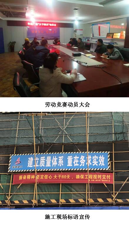 隨后,召開了勞動競賽動員大會,以會議的形式強調參賽班組搶工內容,為順利完成施工任務提供有力保障。并與施工班組簽訂了目標責任狀,明確了活動目標、意義、要求、獎罰標準。