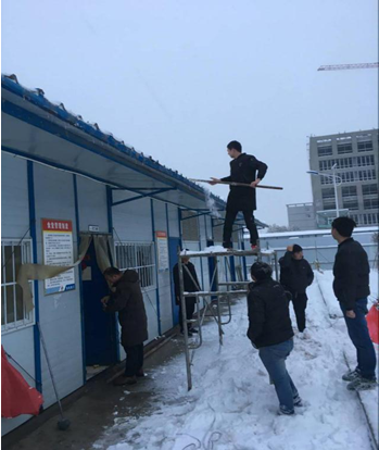 大伙兒冒著寒風(fēng),紛紛拿著鐵鍬、掃帚等打掃工具趕赴掃雪現(xiàn)場,相互配合、齊心協(xié)力,你鏟我掃,一點(diǎn)點(diǎn)地將積雪鏟起集中堆放,一派熱火朝天的景象。經(jīng)過一個(gè)多小時(shí)的奮戰(zhàn),項(xiàng)目部施工現(xiàn)場主要通道和項(xiàng)目部院子、生活區(qū)等地的積雪全部鏟除,看著清理干凈的路面,大家洋溢著開心的笑容。