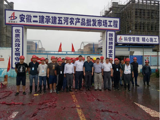 8月29日上午,條幅高懸,鞭炮齊鳴,在業(yè)主、監(jiān)理單位及安徽二建公司領(lǐng)導(dǎo)的共同見證下,由我公司承建的五河農(nóng)產(chǎn)品批發(fā)市場一期項(xiàng)目主體結(jié)構(gòu)順利封頂。