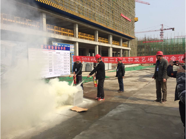 本次演練假想點為鋼筋制作電焊焊接操作區(qū)工人的疏忽,導致附近一些易燃物品著火。演練中操作人員以最快速度拿取滅火器撲滅小火,但火勢在瞬間已無法控制,他立即電話通知電焊班組長,并通知項目應急分隊消防人員。應急分隊義務(wù)消防隊員到位后立即打開滅火器,進行滅火。十分鐘后火勢得到控制。
