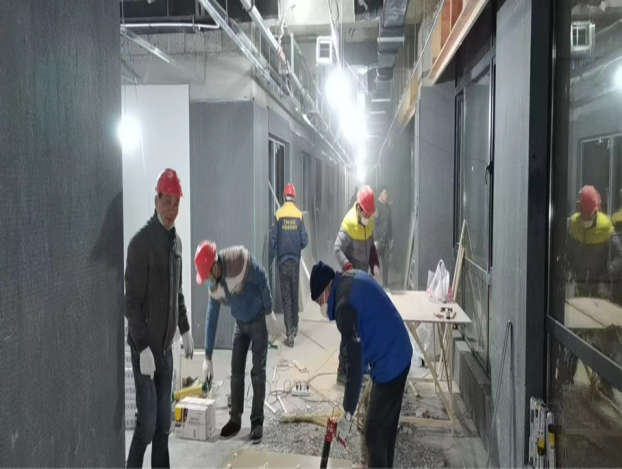自11月底接到肥東縣委縣政府主要領(lǐng)導(dǎo)指示,公共衛(wèi)生綜合樓須提前交付,投入疫情防控使用。根據(jù)公司搶工動(dòng)員大會(huì)精神,第二分公司、項(xiàng)目部迅速行動(dòng)起來,分公司領(lǐng)導(dǎo)親自指揮,全員行動(dòng),火速調(diào)配勞動(dòng)力、材料物資、機(jī)械設(shè)備等資源力量,投入搶工戰(zhàn)役。一天之內(nèi),編排好詳細(xì)的搶工倒排施工計(jì)劃、實(shí)施方案、保證措施,同時(shí)成立各作戰(zhàn)小組,確保各項(xiàng)任務(wù)如期完成。截止目前,外立面裝飾已完成,除五樓由院方負(fù)責(zé)外,各樓層水電消防橋架暖通空調(diào)智能化等穿線、管道設(shè)備安裝已全部完成,裝飾裝修進(jìn)入到攻堅(jiān)階段。地墻面磚已鋪貼完畢,油漆涂料正在收尾。病房?jī)?nèi)吊頂正在安裝,墻面冰火板已安裝鋪貼50%,pvc地板自流平地坪已完成澆筑,室外道排已完成一半,正在全力沖刺最后目標(biāo)。在搶工同時(shí),質(zhì)量和安全也毫不放松,確?!包S山杯”創(chuàng)建,優(yōu)化工藝,提升質(zhì)量標(biāo)準(zhǔn)。安全檢查日查日?qǐng)?bào),及時(shí)消除隱患。